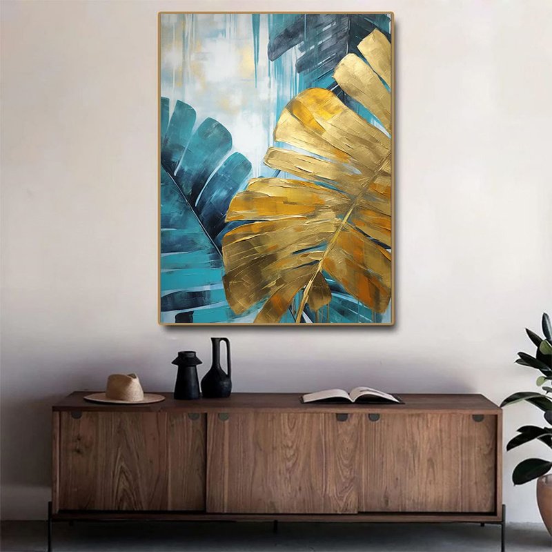 Handmade Oil Painting Canvas Wall Art Decoration Green And Golden Banana Large Leaves For Home Decor Rolled Frameless Unstretched Painting