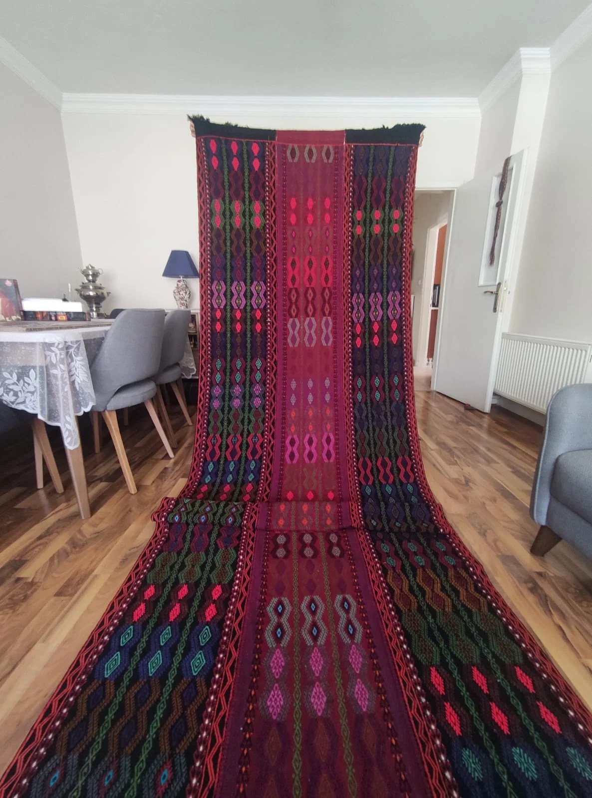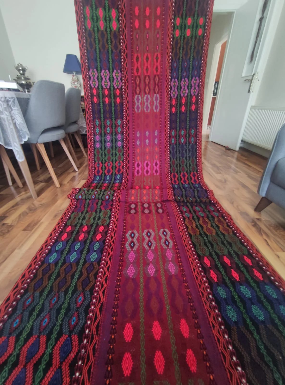 This flat woven is a traditional hand-woven and handicraft “Jejim or Cicim”. It is a hand-woven product of Anatolian and Turkish art that people have produced locally and traditionally for their own needs. This product is made of wool threads, hand-spun yarns, on traditional hand-looms as a handwoven art. It is called “Jejim or Cicim” by its weaving technique. About 60 years old. It is a underused and vintage product.