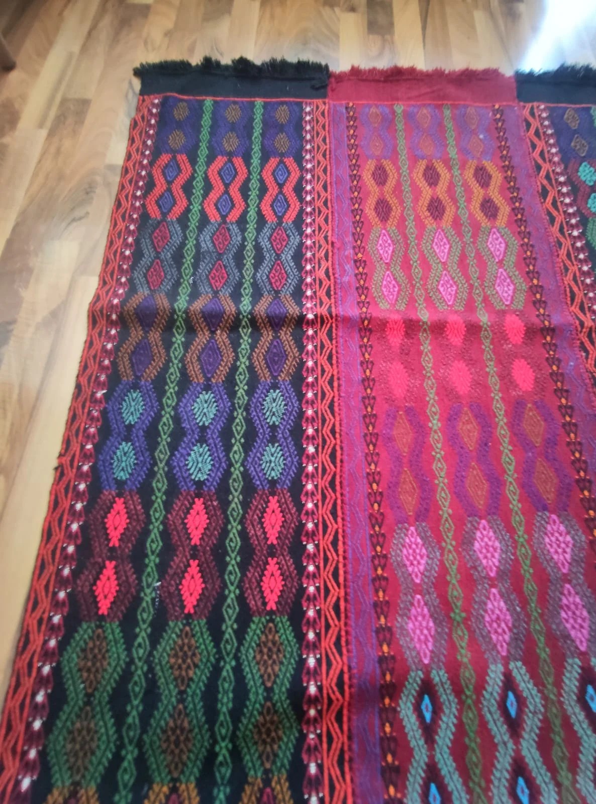 Patterned and colored sections are made of wool yarns. Some motifs of these patterned and colored sections were made by the weaver with synthetic or orlon threads. Motifs made of synthetic threads do not create any contradiction in the general aesthetics of the product. I showed in the video below.