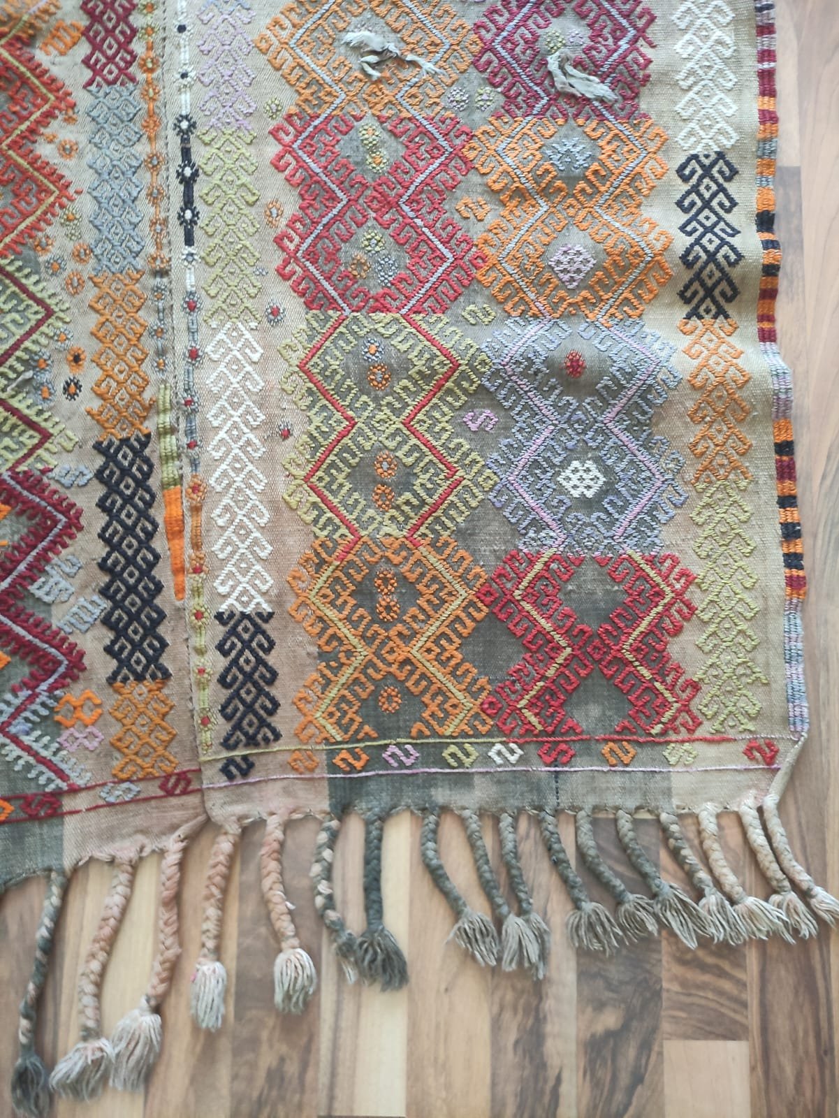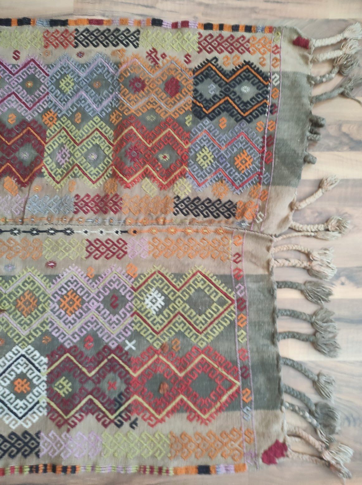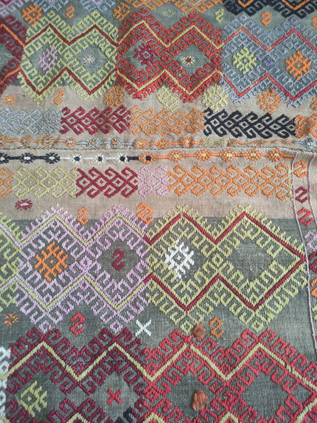 A traditional hand-woven and handicraft “Jejim or Cicim” product. It is a hand-woven product of Anatolian and Turkish art that people have produced locally and traditionally for their own needs. This product is made of cotton threads and wool threads, hand-spun yarns of wool threads, on traditional hand-looms as a hand-woven art. It is called “Jejim or Cicim” by its weaving technique. About 60 years old. Vintage product.