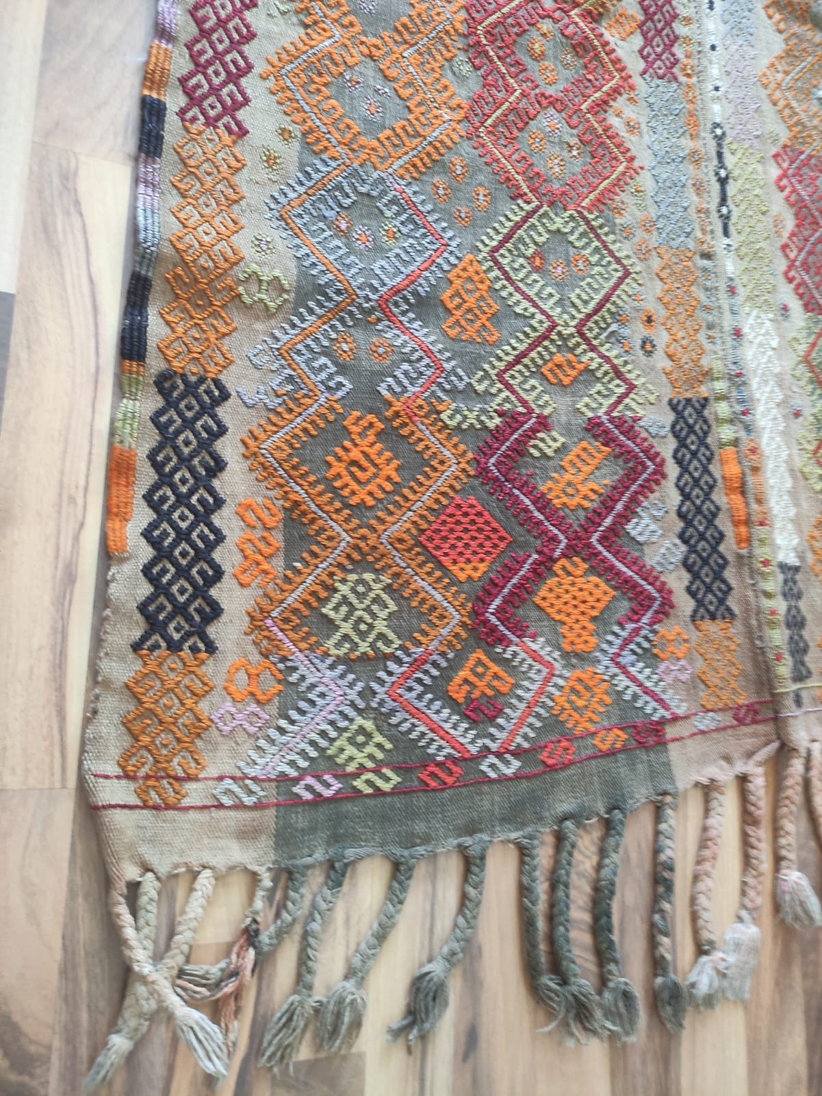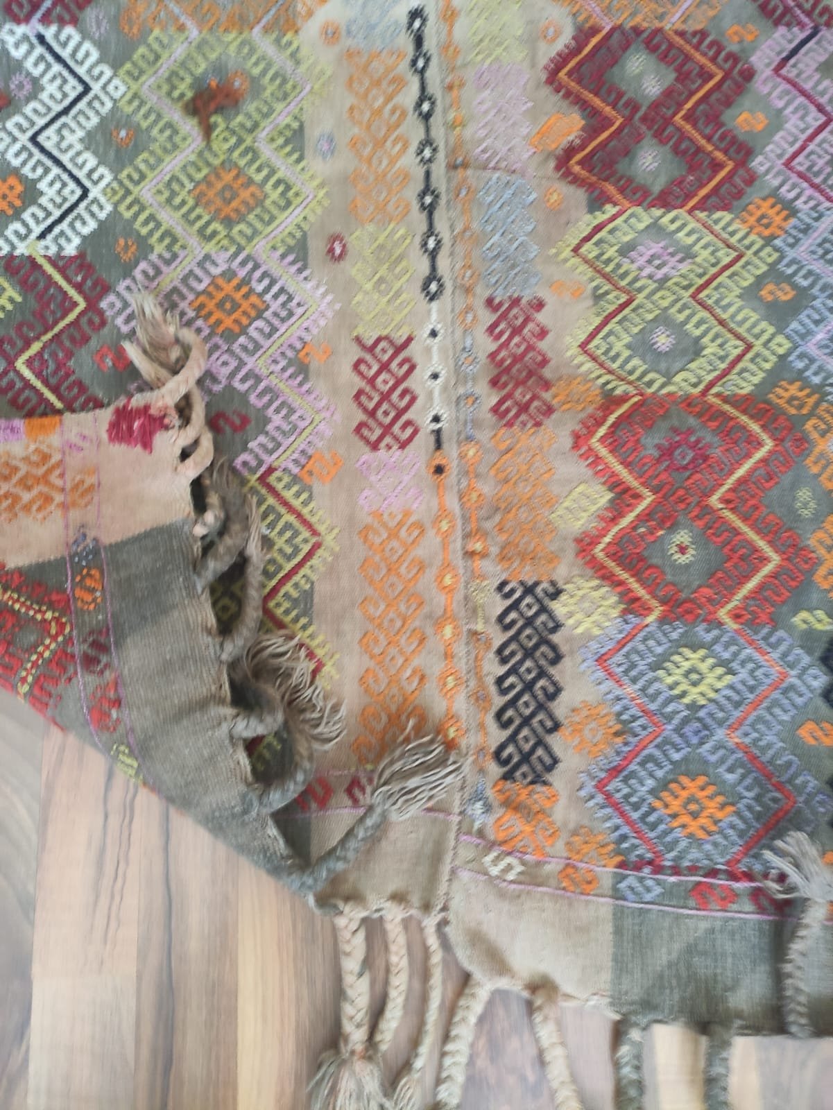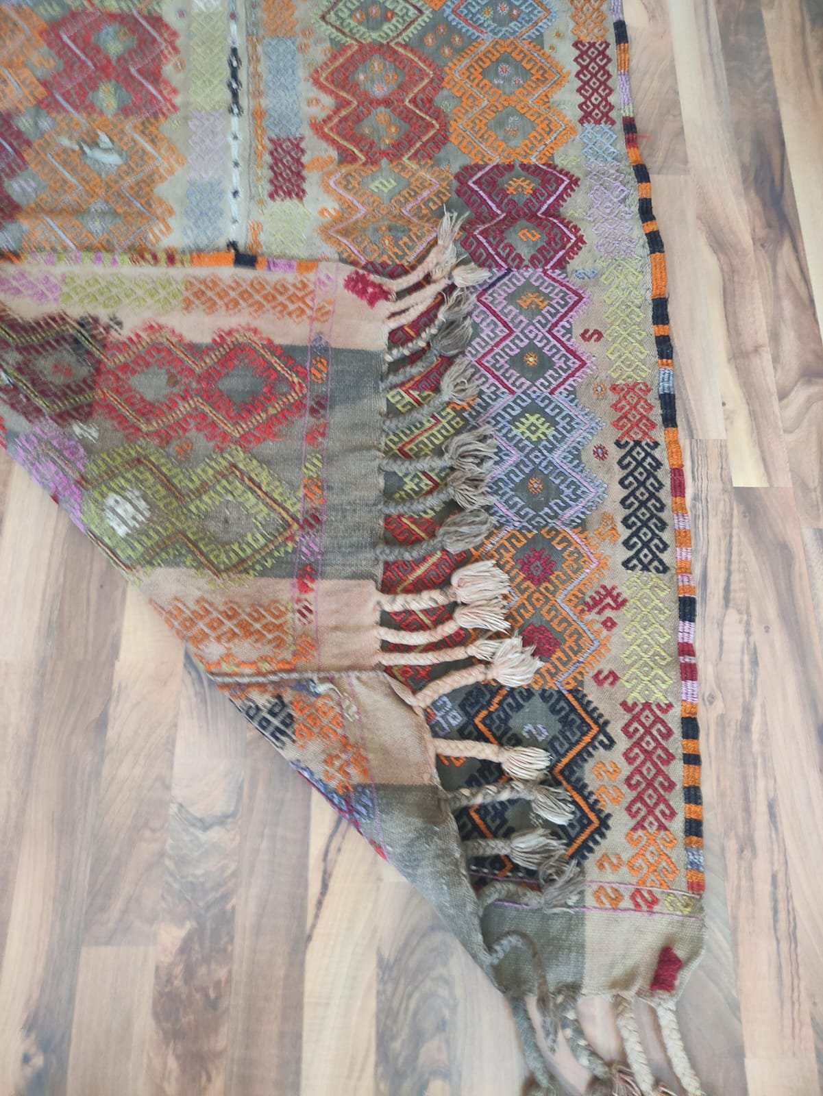 A traditional hand-woven and handicraft “Jejim or Cicim” product. It is a hand-woven product of Anatolian and Turkish art that people have produced locally and traditionally for their own needs. This product is made of cotton threads and wool threads, hand-spun yarns of wool threads, on traditional hand-looms as a hand-woven art. It is called “Jejim or Cicim” by its weaving technique. About 60 years old. Vintage product.