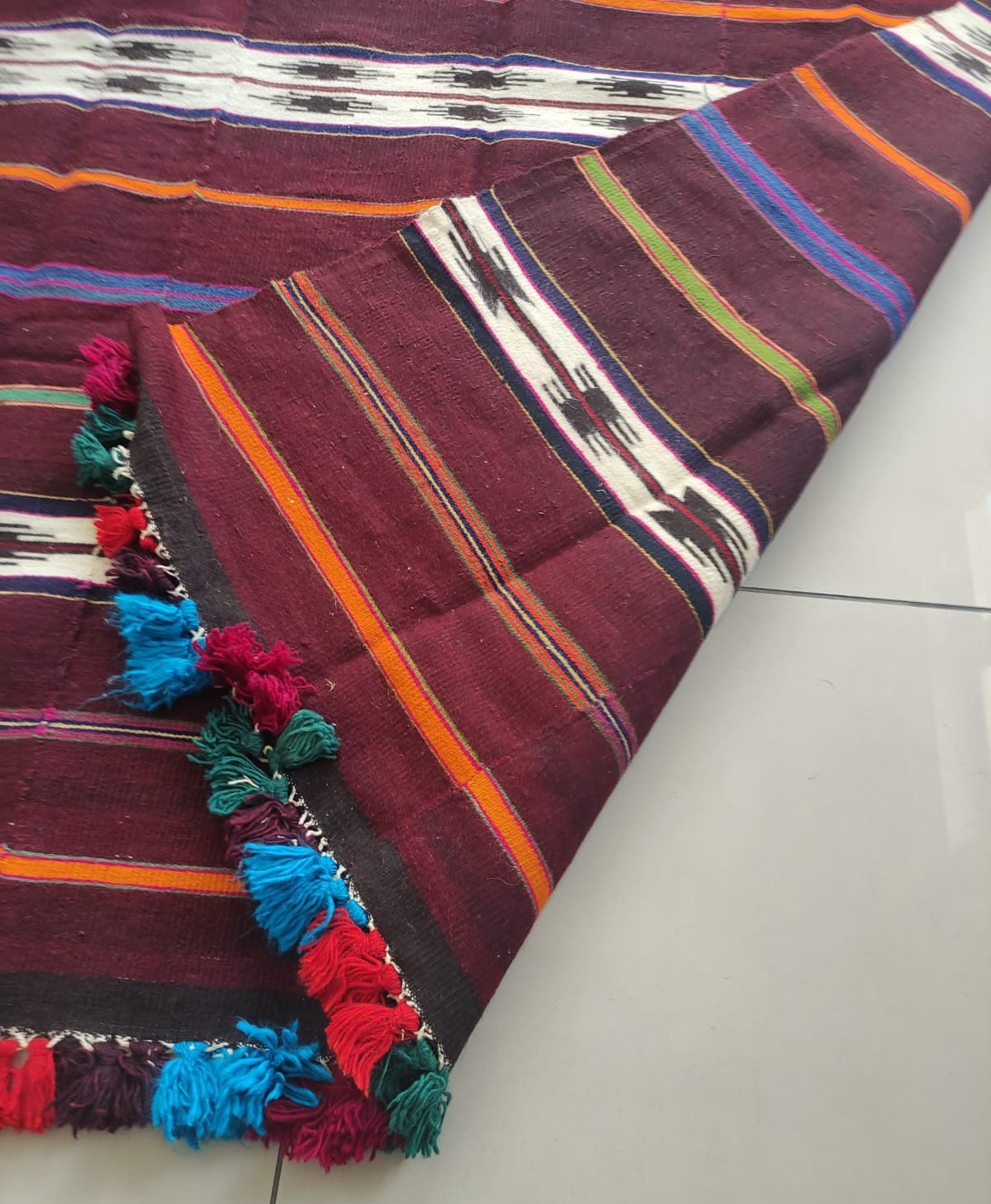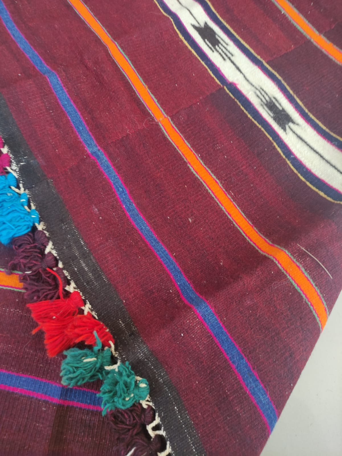 The warp threads (fringe section) of this Kilim weaving are made of cotton threads. The weft threads are made of wool threads.