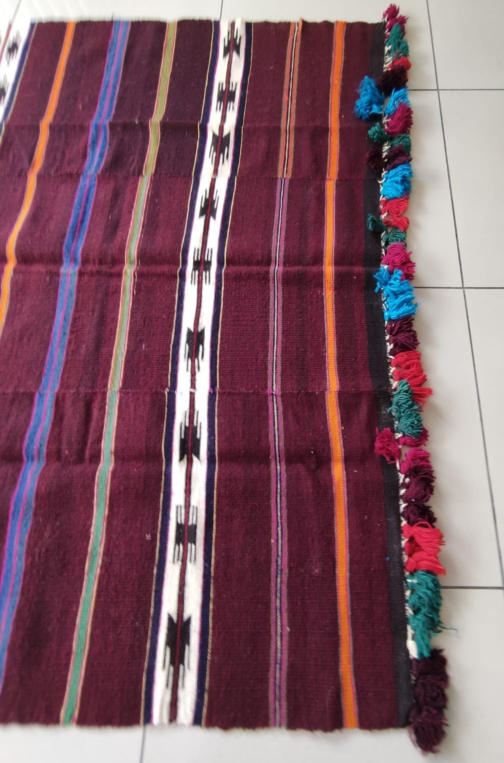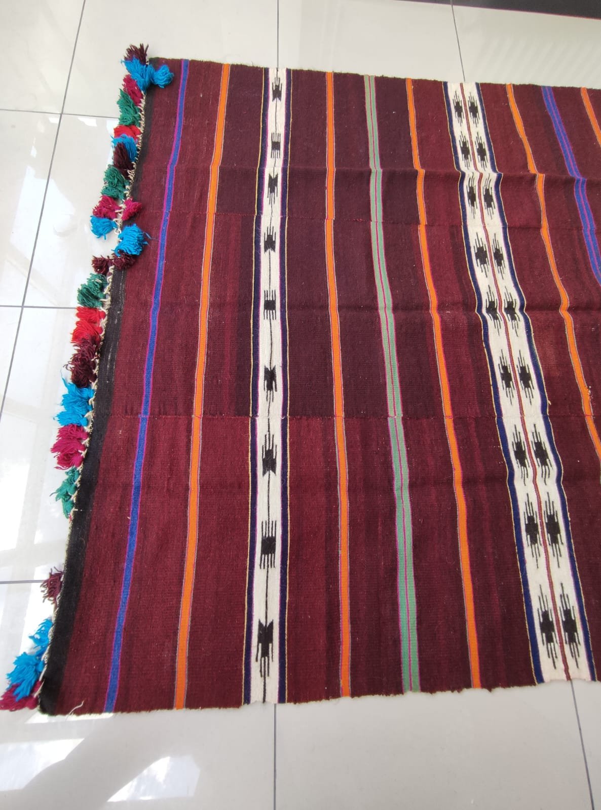 This product is made of wool yarns, on traditional hand-looms as a hand-woven art. It is called “Kilim” by its weaving technique. Vintage product.