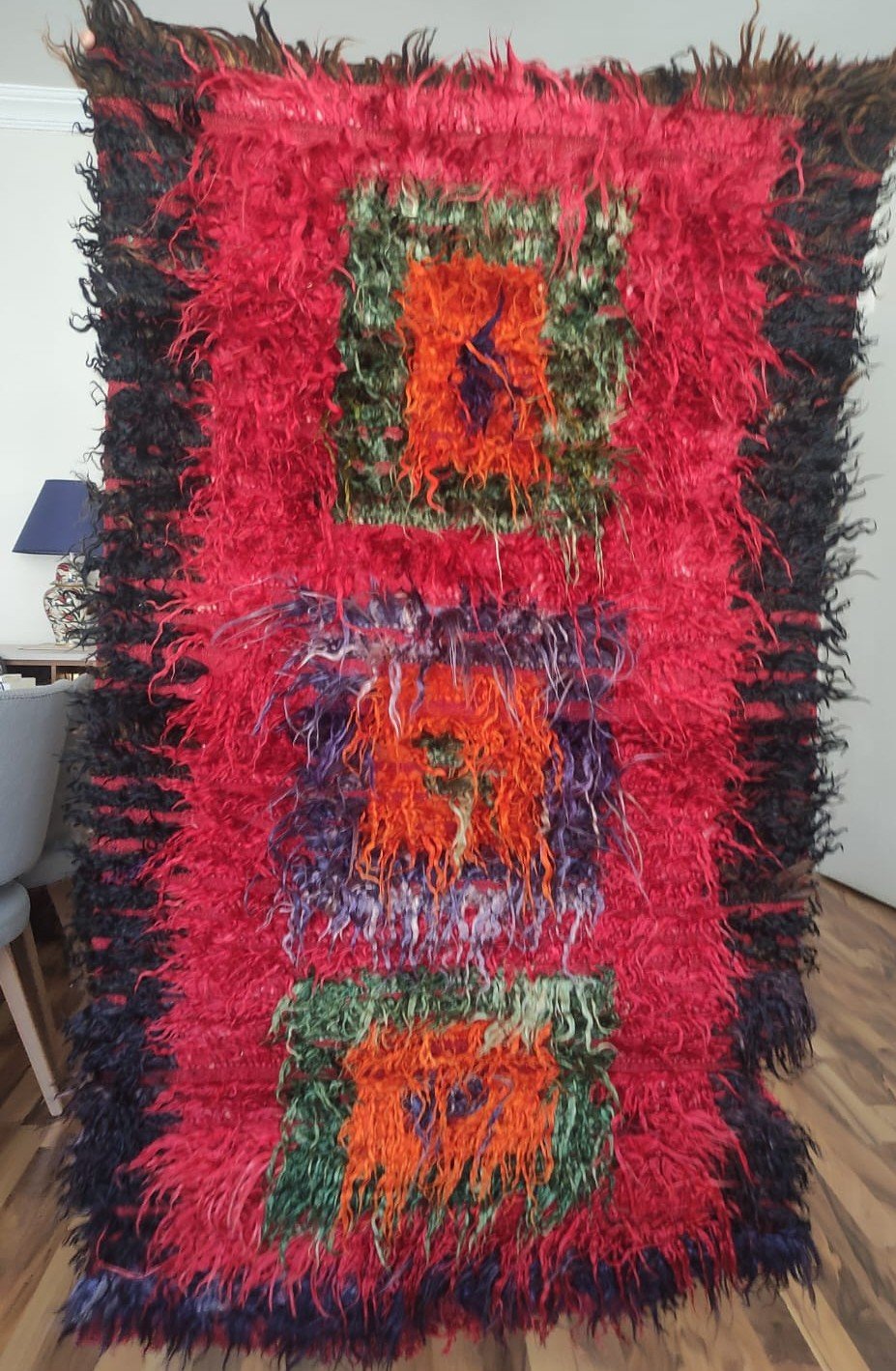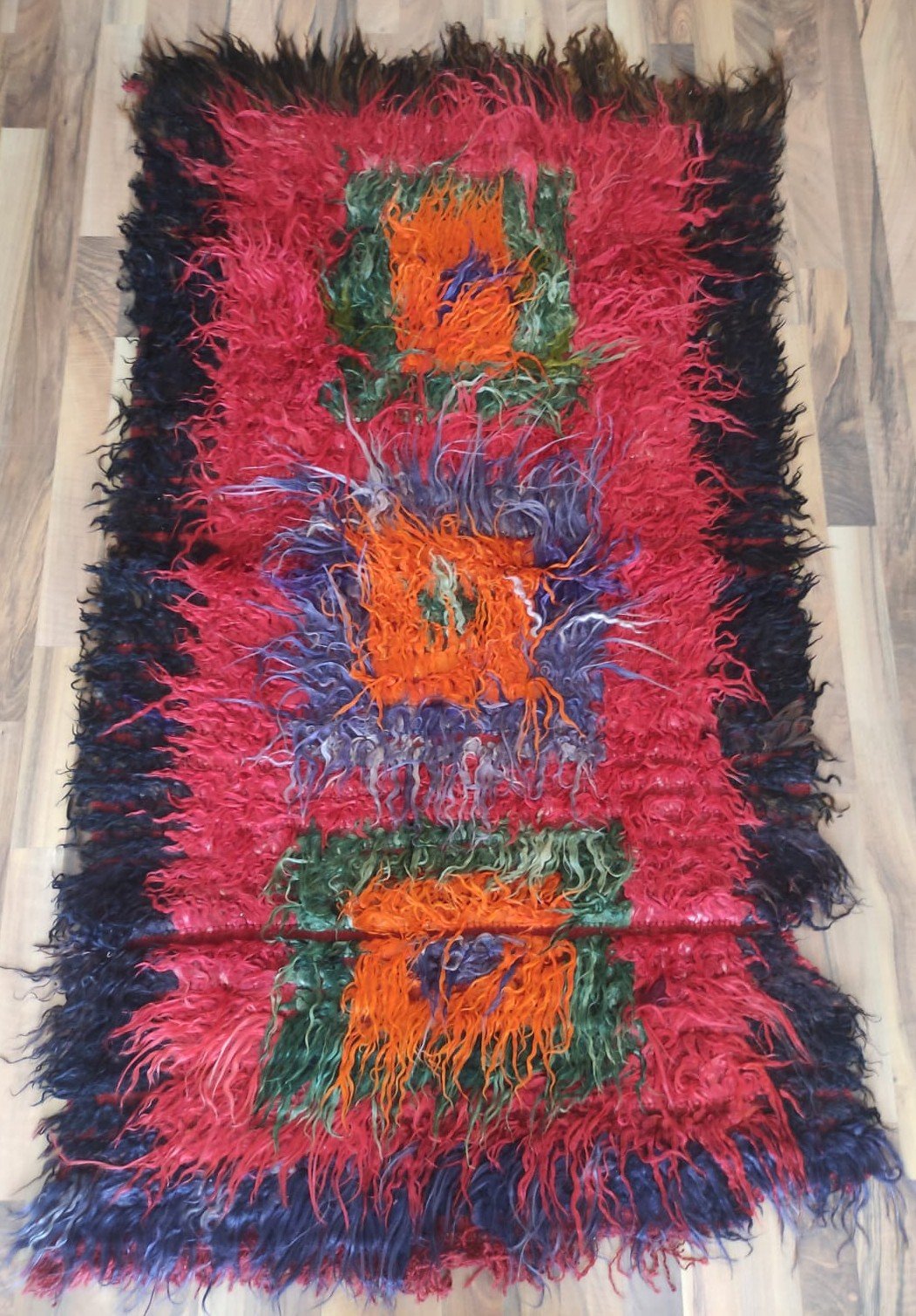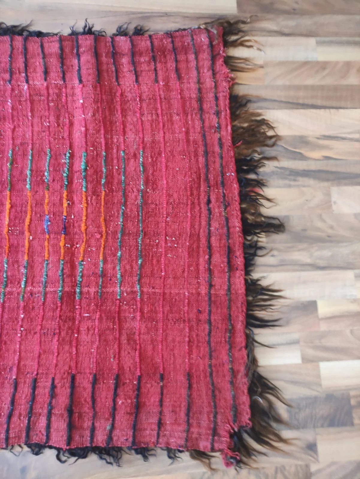 This flat woven is a traditional hand-woven and handicraft “Tulu Rug”. It is a hand-woven product of Anatolian and Turkish art that people have produced locally and traditionally for their own needs. This product is made of wool threads, hand-spun yarns, on traditional hand-looms as a hand-woven art. It is called “TULU, TULUCE or FILIKLI” by its weaving technique. The feathers used on the weaving were obtained from a special breed, the Angora Goat, from the Ankara region in Türkiye.About 50 years old. It is a used and vintage product.