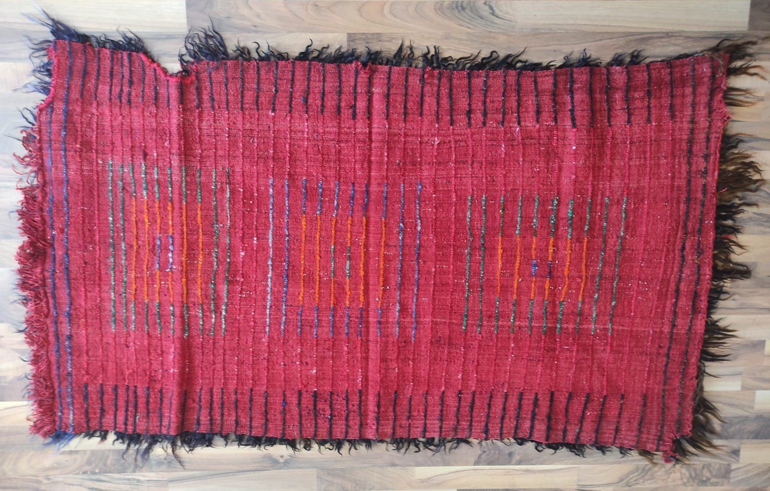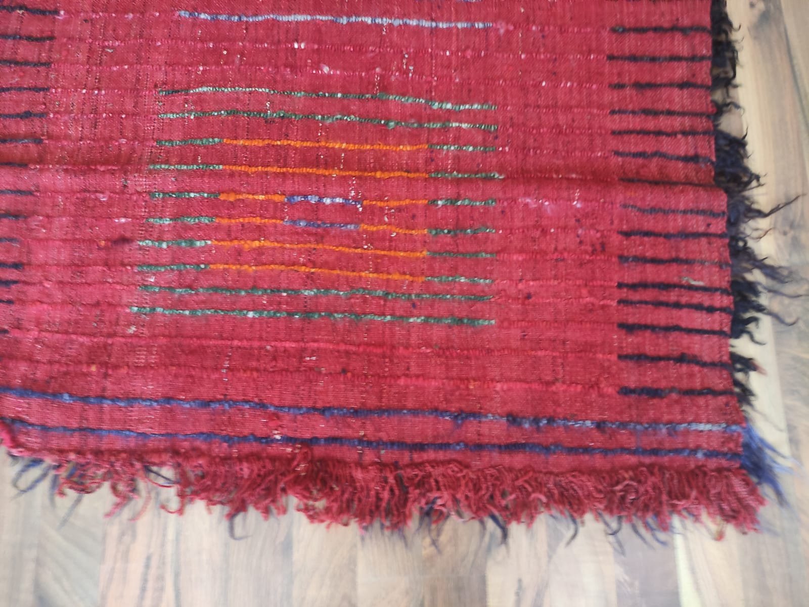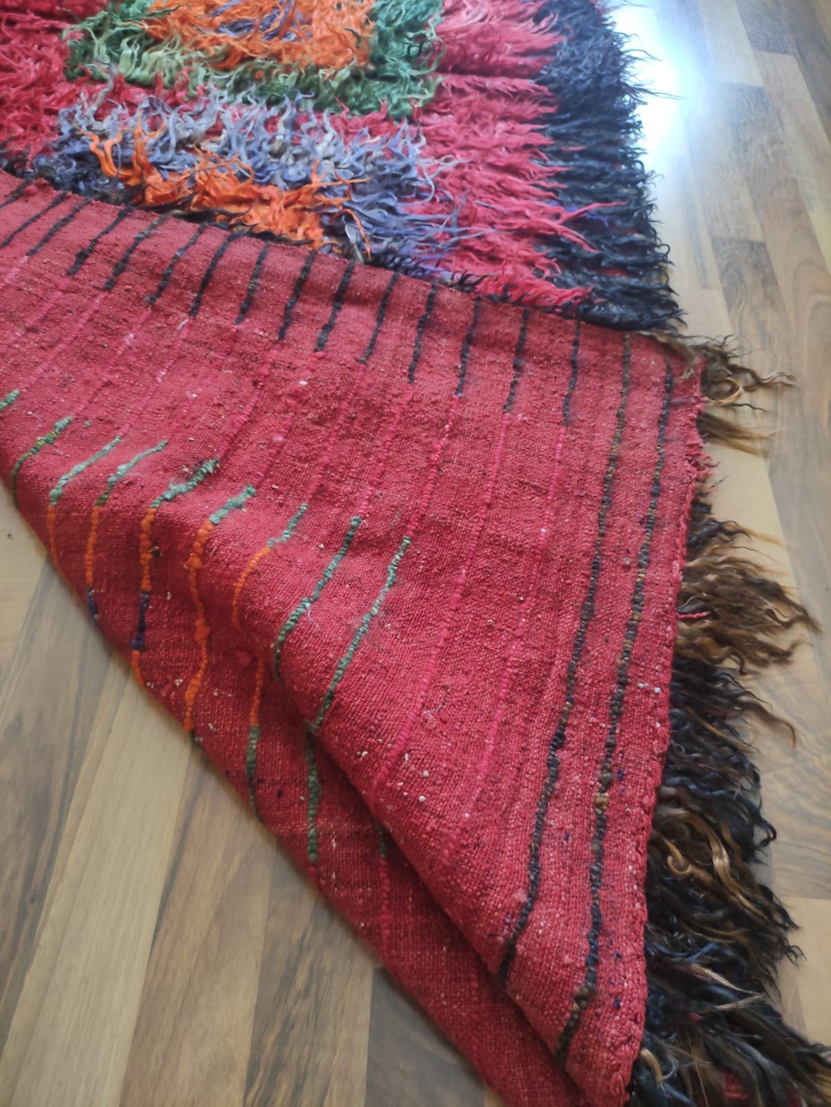 This flat woven is a traditional hand-woven and handicraft “Tulu Rug”. It is a hand-woven product of Anatolian and Turkish art that people have produced locally and traditionally for their own needs. This product is made of wool threads, hand-spun yarns, on traditional hand-looms as a hand-woven art. It is called “TULU, TULUCE or FILIKLI” by its weaving technique. The feathers used on the weaving were obtained from a special breed, the Angora Goat, from the Ankara region in Türkiye.About 50 years old. It is a used and vintage product. There are worn parts as seen from the back of the rug.